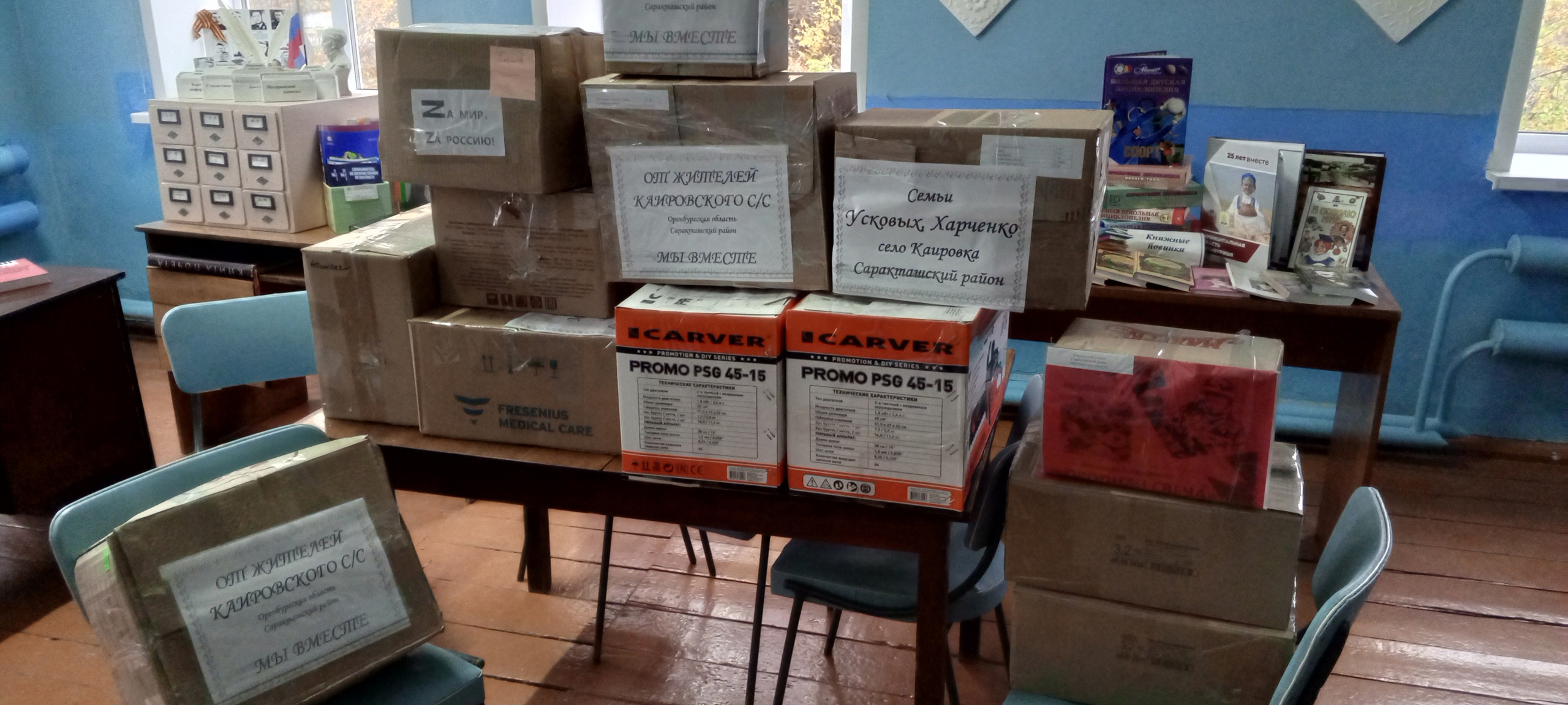 Гуманитарный груз для бойцов СВО, собранный от жителей муниципального образования Каировский сельсовет доставлен в районную библиотеку. Жители с. Каировка и МОБУ Екатериновская ООШ собрали 13 коробок с продовольствием и вещами. На денежные средства жителей д. Ладыгино, д. Нехорошевка, д. Смочилино и с. Каировка закуплены 2 бензопилы, 4 цепи и 4 литра масла. МОБУ Каировская ООШ на средства сотрудников закупили 2 газовые плитки и к ним дополнительно 22 газовых баллончика.