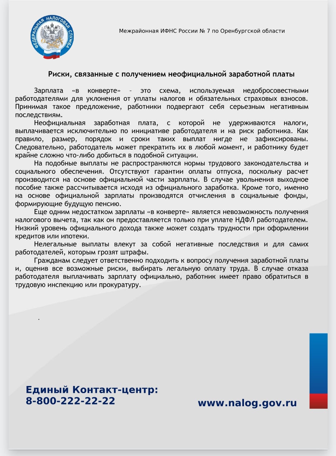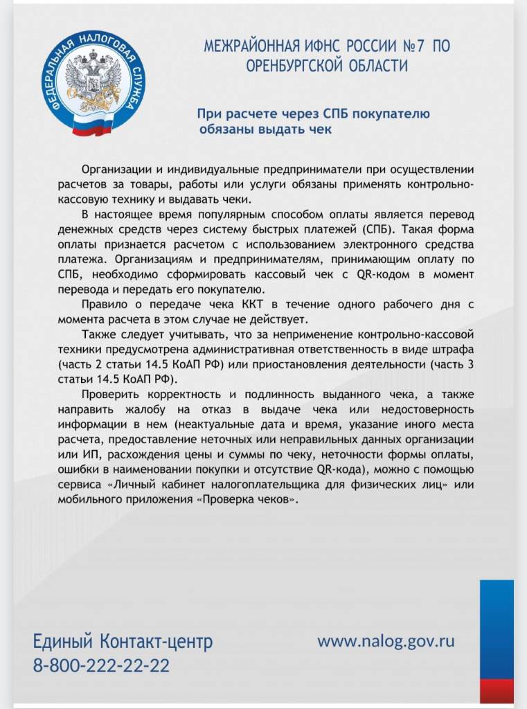 Межрайонная ИФНС России N 7 по Оренбургской области напоминает жителям о необходимости получения чеков в кафе, ресторанах и других заведениях общепита. Чек – это не только подтверждение оплаты, но и важный юридический документ, защищающий права потребителей. Он позволяет контролировать расходы и является информацией для налоговой службы о товарообороте предприятия (ИП) . Налоги, уплачиваемые предприятиями, поступают в бюджет и направляются на социальные программы, строительство дорог, образование, здравоохранение и другие важные сферы. Уклонение от уплаты налогов ведет к потере средств, которые могли бы быть направлены на улучшение жизни граждан. Если вам отказывают в выдаче чека, вы можете обратиться в налоговую инспекцию с жалобой через официальный сайт, лично или направить сообщение через прилагаемый QR- код. Важно указать название и адрес заведения, дату и время посещения, а также подробное описание ситуации. За невыдачу чека предусмотрены штрафы. Совет потребителям: Требуйте чек! Это ваше законное право. Не стесняйтесь напоминать сотрудникам заведения о необходимости его выдачи. В случае отказа сообщайте в налоговую инспекцию. Получение чека – это вклад в благополучие общества и района