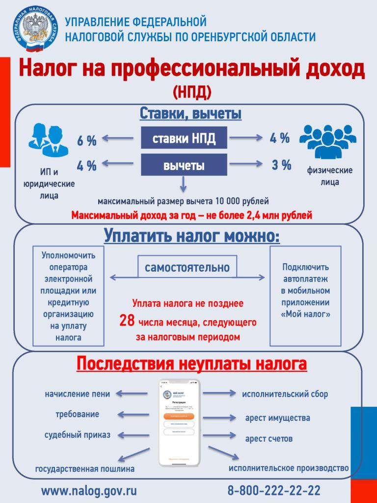 Налог на профессиональный доход - это специальный налоговый режим. Его могут использовать физические лица как со статусом индивидуального предпринимателя, так и без статуса индивидуального предпринимателя,  которые оказывают услуги или продают  товары собственного производства.          Налоговые ставки по налогу на профессиональный доход:  4%,  если заказчик физическое лицо без статуса индивидуального предпринимателя;  6% , если юридическое лицо  или индивидуальный предприниматель.             На данном режиме налогообложения есть ограничения: доход не должен превышать 2,4 млн. рублей за календарный год; нельзя принимать работников по трудовому договору или продавать товары, подлежащие обязательной маркировке.          При применении налога на профессиональный доход нет необходимости предоставлять отчетность, достаточно сформировать чек в приложении "Мой налог", и сумма налога рассчитается автоматически.  Уплатить налог необходимо не позднее 28-го числа месяца, следующего за истекшим налоговым периодом.          Самым удобным и надежным способом обеспечить своевременную уплату налога на профессиональный доход и избежать начисления пени  является автоматическая уплата налога (автоплатеж), который можно настроить  в мобильном приложении «Мой налог» или в сервисе «Кабинет налогоплательщика НПД» на сайте ФНС России.          Уплату налога можно произвести и квитанцией, которая  автоматически формируется налоговым органом и направляется налогоплательщику в приложение «Мой налог». Для простоты уплаты квитанция содержит специализированный QR-код. Получив квитанцию, есть возможность оплатить налог любым из следующих способов:  - непосредственно через мобильное приложение «Мой налог; - в мобильном приложении Вашего банка или на сайте любого платежного сервиса по платежным реквизитам из квитанции или отсканировав QR-код из нее; через портал государственных услуг Российской Федерации; - лично обратиться с квитанцией в любой банк, банкомат или платежный терминал.          Налог на профессиональный доход также может быть оплачен в составе Единого налогового платежа.          Уплата налога в срок позволит не допустить образование задолженности и связанных с ней ограничений.          Для  получения  информации  о  налоговой  задолженности  можно  обратиться  как в Долговой центр (Межрайонная ИФНС России №15 по Оренбургской области), так и в территориальный налоговый орган.